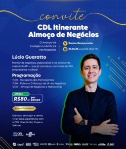 A Câmara de Dirigentes Lojistas (CDL) de Uberlândia promove, no próximo 21 de maio, mais uma edição do CDL Itinerante, reunindo empresários, empreendedores e profissionais para um momento de networking, atualização e troca de conhecimento. O encontro será realizado a partir das 11h, no Restaurante Barolo (Center Shopping), e contará com a palestra “O avanço da inteligência artificial nos negócios”, conduzida por Lúcio Guaratto, sócio da empresa de educação empreendedora Zuper.