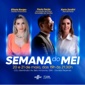 A Câmara de Dirigentes Lojistas (CDL) de Uberlândia, em parceria com o Sebrae, realizará nos dias 20 e 21 de maio a Semana do Microempreendedor Individual (MEI), um evento gratuito para todos os empreendedores individuais da região. Para capacitar e impulsionar os negócios dos empresários, especialistas vão abordar temas como: Gestão financeira, Formação do preço de venda, Estratégias para ampliar suas vendas e a Importância do atendimento. O evento acontecerá na CDL, no Espaço Sala + (4º andar), das 19h às 21h30.
